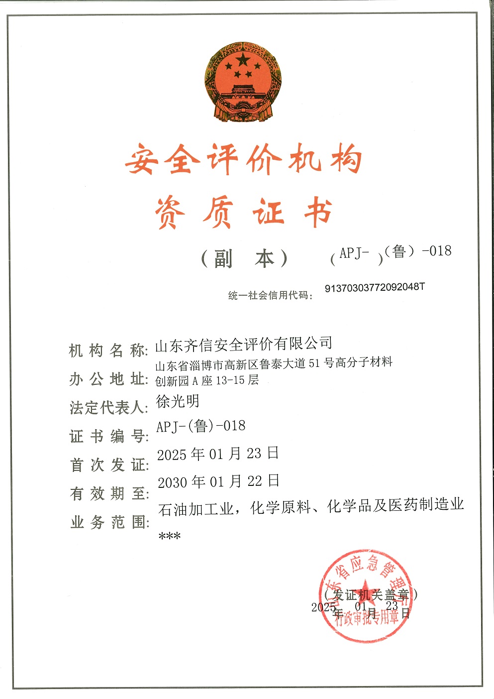 山東齊信安全評(píng)價(jià)有限公司成立于2005年3月,注冊(cè)資本300萬元人民幣,固定資產(chǎn)總值804.8728萬元。法定代表人徐光明,注冊(cè)地址及辦公地址位于淄博高新區(qū)魯泰大道51號(hào)高分子材料創(chuàng)新園A座13-15樓。2005年9月取得安全評(píng)價(jià)機(jī)構(gòu)乙級(jí)資質(zhì)。自國家應(yīng)急部1號(hào)令實(shí)施以來,公司于2020年1月15日取得新安全評(píng)價(jià)資質(zhì),業(yè)務(wù)范圍包括:陸上油氣管道運(yùn)輸業(yè);石油加工業(yè),化學(xué)原料、化學(xué)品及醫(yī)藥制造業(yè);金屬冶煉。2018年12月21日取得安全生產(chǎn)標(biāo)準(zhǔn)化二級(jí)評(píng)審單位,評(píng)審范圍:危險(xiǎn)化學(xué)品、紡織、建材、輕工、冶金、機(jī)械。              公司現(xiàn)有人員41人,其中專職安全評(píng)價(jià)師37人,注冊(cè)安全工程師26人,研究員1人、碩士5人、雙學(xué)士1人,山東省安全專家?guī)鞂<?人、教授級(jí)高工1人,高級(jí)工程師8人、工程師22人,專職危險(xiǎn)化學(xué)品標(biāo)準(zhǔn)化評(píng)審員、工商貿(mào)標(biāo)準(zhǔn)化評(píng)審員30人,本科以上學(xué)